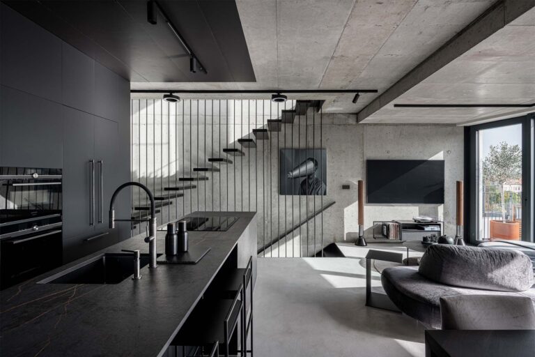 El hormigón, el acero y el color negro dialogan con la luz en este apartamento