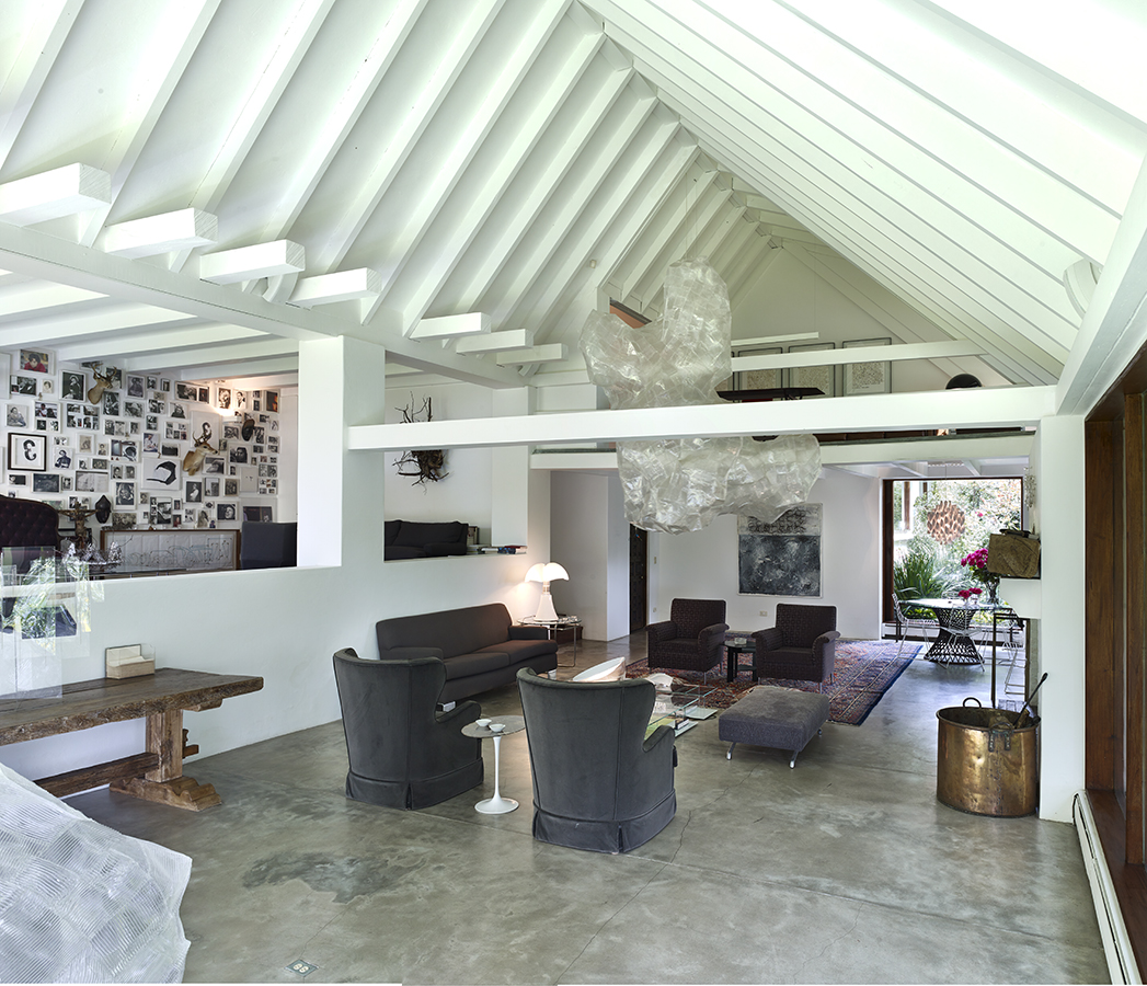 La sala es un espacio concebido para compartir con amigos, leer un libro o simplemente descansar. En la paleta predominan los colores neutros, que crean un ambiente distendido. El piso de microcemento pulido aporta una base idónea para que sobresalgan elementos como la mesa de centro –que en otra época fue para masajes–, los sofás de lona cruda, diseñados por un amigo suyo de Nueva York, y los pufs de cuero, de la diseñadora surcoreana Christina Kim, para su firma Dosa.