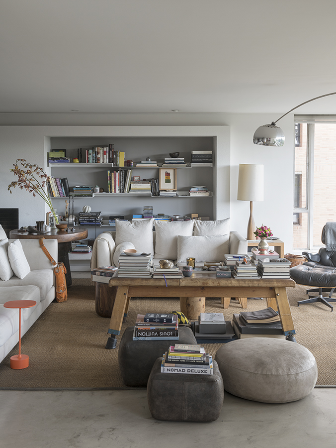“Tiendo a gravitar hacia las fibras naturales, la madera y el cuero”, añade el propietario, fanático del arte y el diseño, como se evidencia en íconos como la silla Eames, la mesa auxiliar de cartón corrugado de Frank Gehry o la mesita naranja, del brasilero Jader Almeida. En el fondo, enmarca el conjunto una biblioteca diseñada por el bogotano Guillermo Arias.