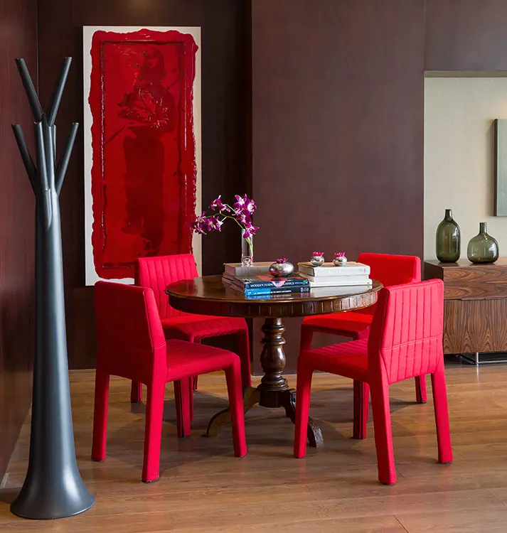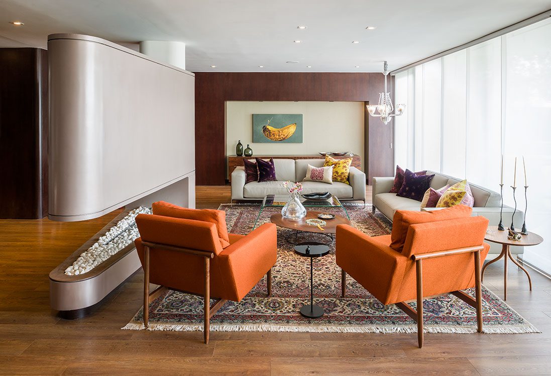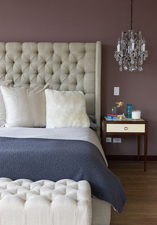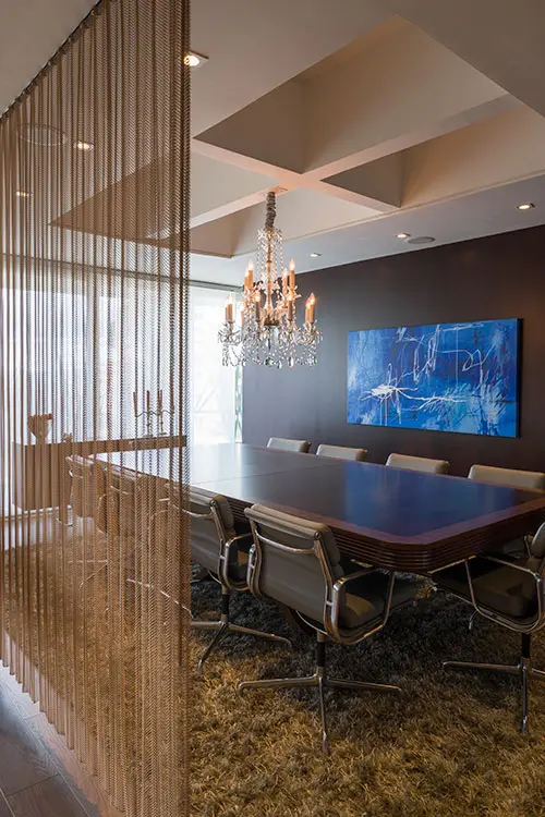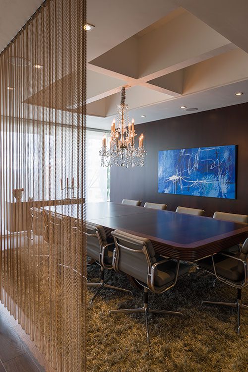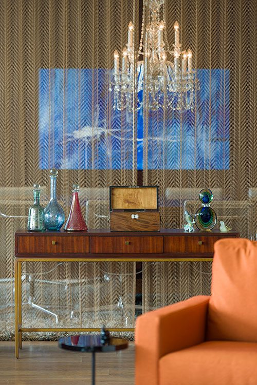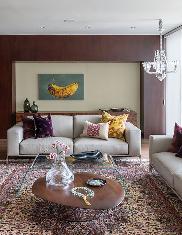 También sobresale una cortina entrelazada de hierro dorado que divide sutilmente la sala del comedor y que proyecta una iluminación suave e íntima que logra un efecto de placidez y calma. Ya en el ambiente privado el apartamento adquiere un aire más relajado y moderno, pues es el espacio para estar en familia, donde un amplio family room con sofá en “L” y cuadros y objetos de colores fuertes aportan una identidad más fresca.