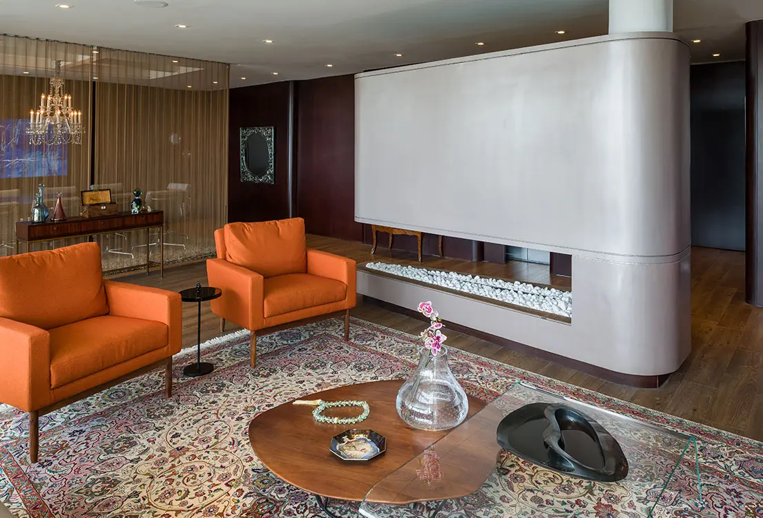 La sala, impactante por su amplitud y luz natural, está determinada por un mobiliario proveniente de grandes firmas de diseño que a la vez se mezcla con otras piezas heredadas y algunas con las que ya había convivido la dueña.