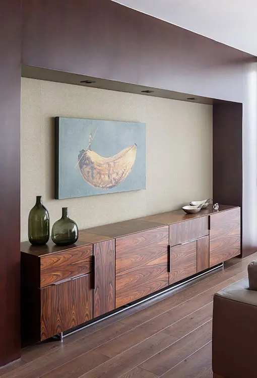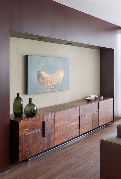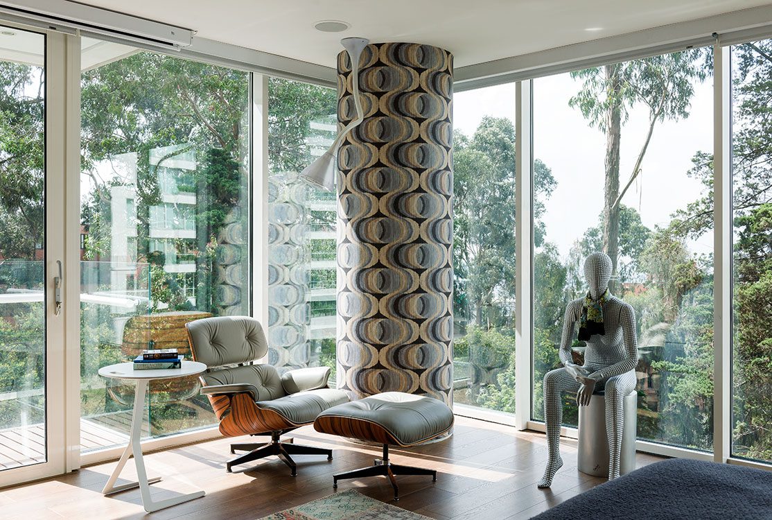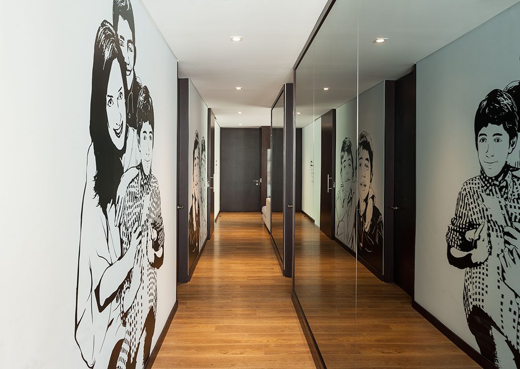 Igualmente, el corredor que conduce a las habitaciones no pasa desapercibido, sus vinilos de gran formato –como si fueran fotografías– también constituyen un reflejo de la personalidad de quienes habitan la residencia. La carpintería es otro componente relevante de la arquitectura interior, pues adiciona calidez a este hogar cuya estructura y distribución fueron diseñadas por su dueña. El resultado: zonas que realmente se viven y aprovechan al ciento por ciento. Un espacio de ambiente femenino.