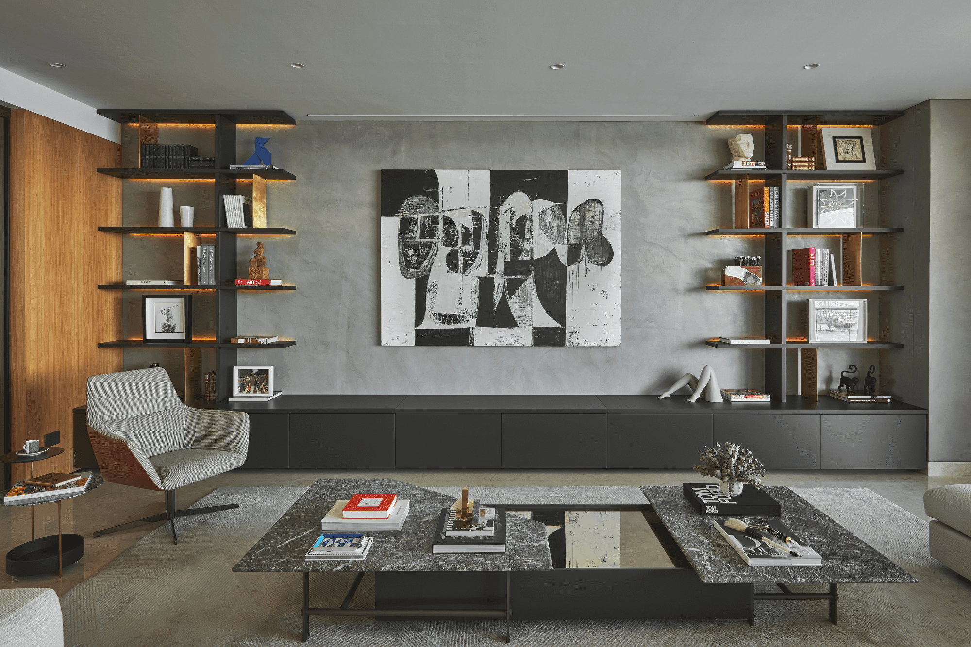 El microcemento también está presente en varias de las paredes que componen la zona social. Y gracias a su textura opaca, contrasta a la perfección con el arte expuesto en el apartamento. Algunas de estas obras ya habían sido adquiridas, otras fueron curadas por la arquitecta junto con los propietarios.