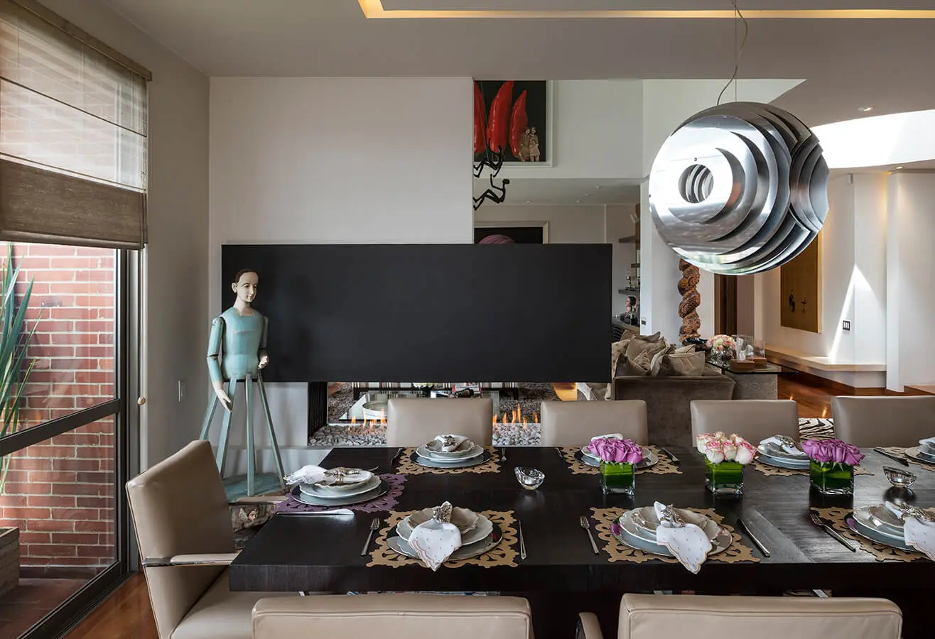 Las lámparas del comedor y del salón, diseños de la firma Foscarini y del británico Tom Dixon, son obras en sí mismas, al igual que las sillas Brno, de Mies van der Rohe, que usaron en el comedor. El tapete del salón, de 9 metros de largo por 3,50 metros de ancho, es obra del arquitecto y diseñador textil Jorge Lizarazo, y complementa la poblada colección de arte y mobiliario que lo rodea: pinturas, litografías y esculturas que se han ido adquiriendo en ferias y galerías de arte, en ciudades tan diversas como Londres, Miami, Madrid o Bogotá.