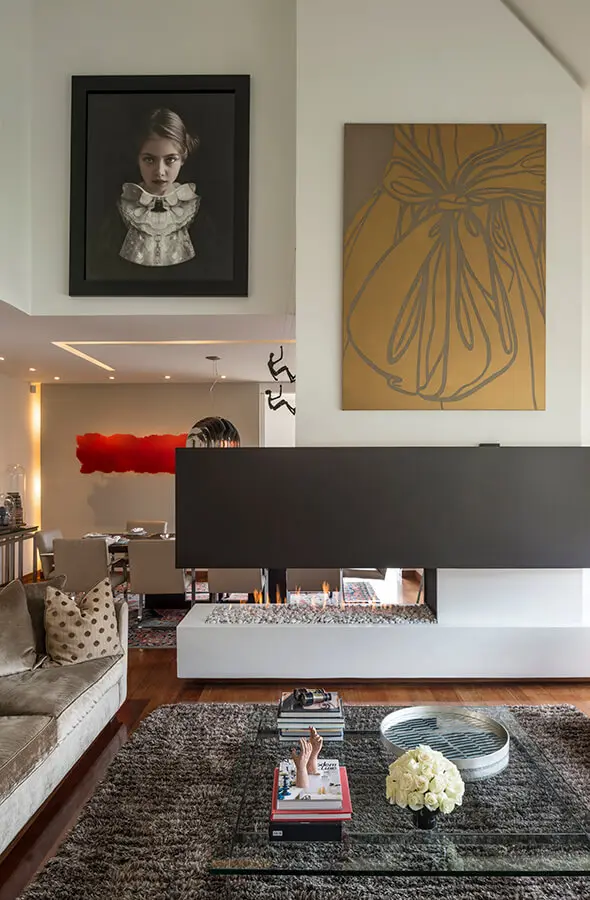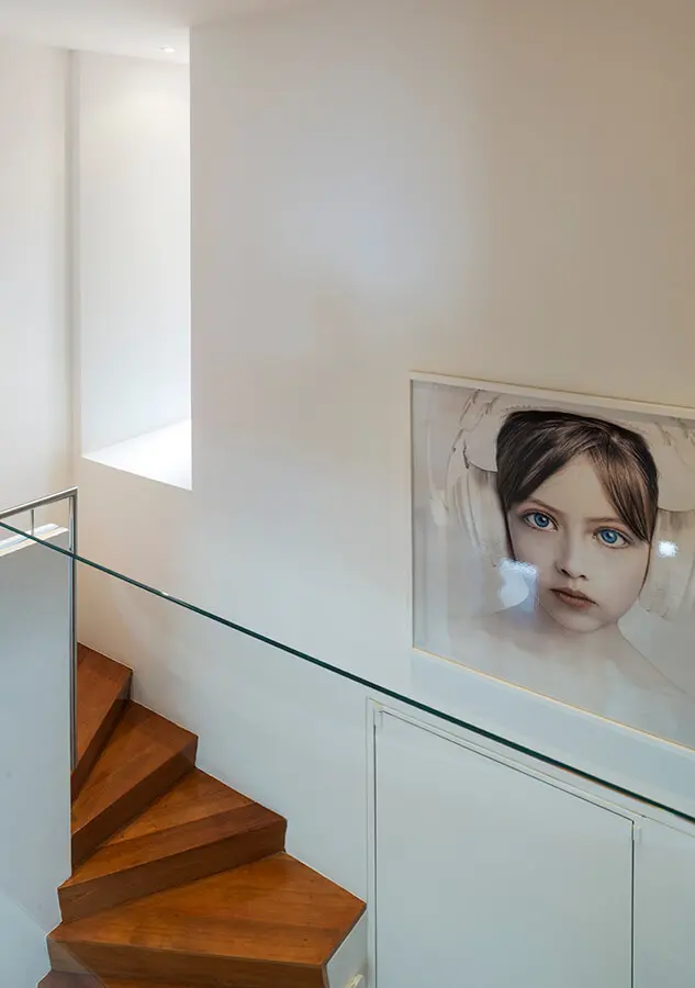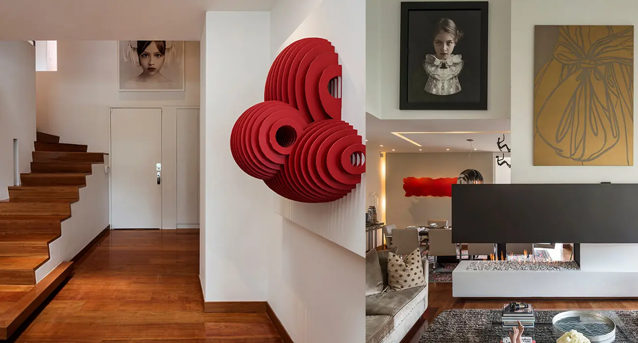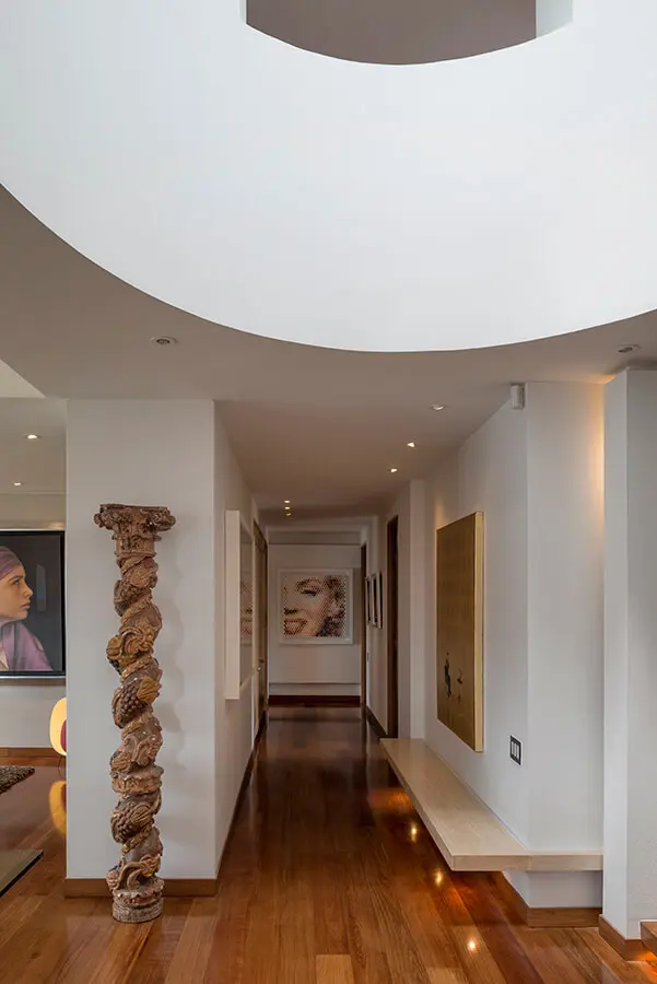 Los omnipresentes muros blancos, resaltados por la superficie continua y homogénea de madera maciza de guayacán que compone el piso, generan un telón de fondo neutro que se llena de contenido a partir de las diversas piezas de arte y decoración que la propietaria y el arquitecto ubicaron en los diferentes espacios. De esta manera, el corredor de acceso nos recibe no solo con su doble altura y lucernario, sino también con la escultura metálica Ratón rojo, del artista Pablo Tamayo, cuyo muro fue necesario reforzar para poder servir de soporte y sostener su peso.