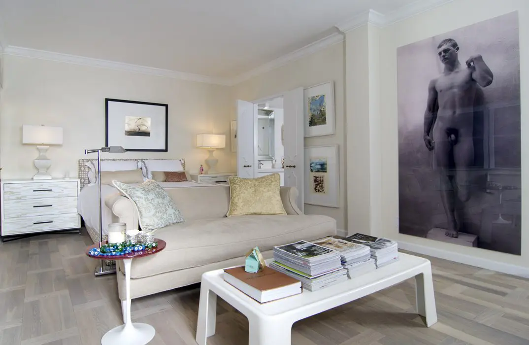El propietario buscaba un lugar cómodo, tranquilo y glamuroso donde el diseño estuviera pensado en torno a las piezas de arte. “Quería que el espacio se prestara para mover las obras de lugar sin necesidad de estar cambiando los muebles”, afirma. Además, le pidió a Arcila convertir el estudio en una oficina funcional, crear una habitación de huéspedes y concebir un cuarto principal cálido y confortable –este último destaca por un sobrio parquet de madera–.