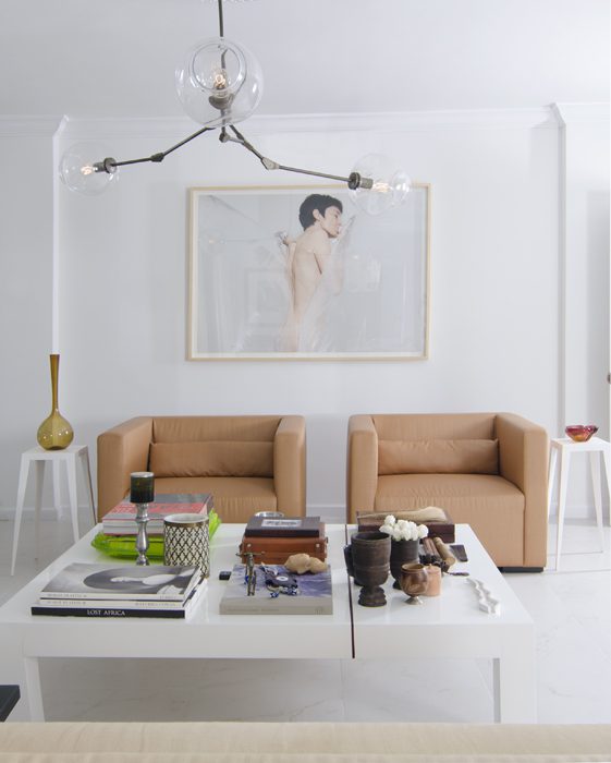 A un lado de este espacio, concebido como un gran loft, está la sala –con muebles diseñados por Arcila– y un singular chandelier con globos de vidrio de la artista Lindsey Adelman. Al otro, la cocina: una zona ideada con mobiliario de Ikea y donde el blanco es protagonista. Para el piso, originalmente una baldosa de color durazno, el diseñador optó por una porcelana de Carrara de gran formato que le dio frescura y modernidad al apartamento.