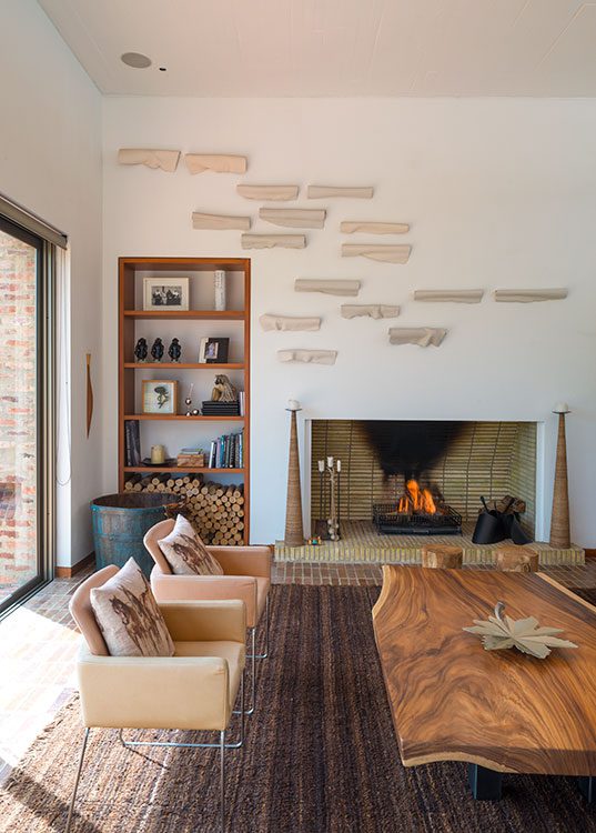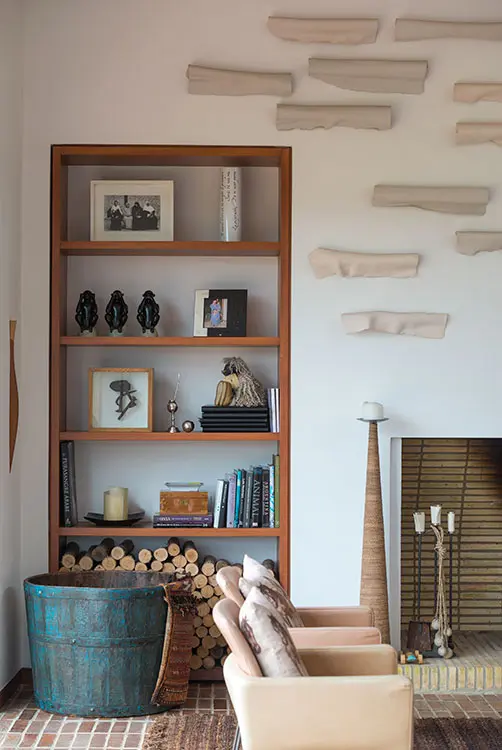 Las fotografías y memorias de los viajes de la familia se mezclan con obras de artistas colombianos como Gonzalo Garavito, las esculturas de la uruguaya Carol Young sobre la chimenea, los kilims traídos de Turquía y la gran mesa de centro de la sala, una sola pieza de madera natural elaborada por Vivian Bock. Las texturas de las puertas tejidas en matamba (diseñadas por el arquitecto), la mesa de la cocina, de Arte y Ritual, y las naturales formas que se encuentran en las mesas auxiliares de la sala de Savile Arte contrastan con otros elementos de líneas precisas y contemporáneas, como el comedor o la lámpara de bronce del cuarto principal, productos de la firma BoConcept.