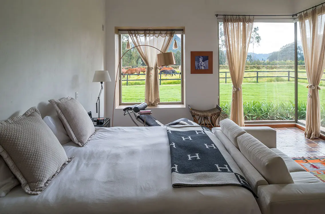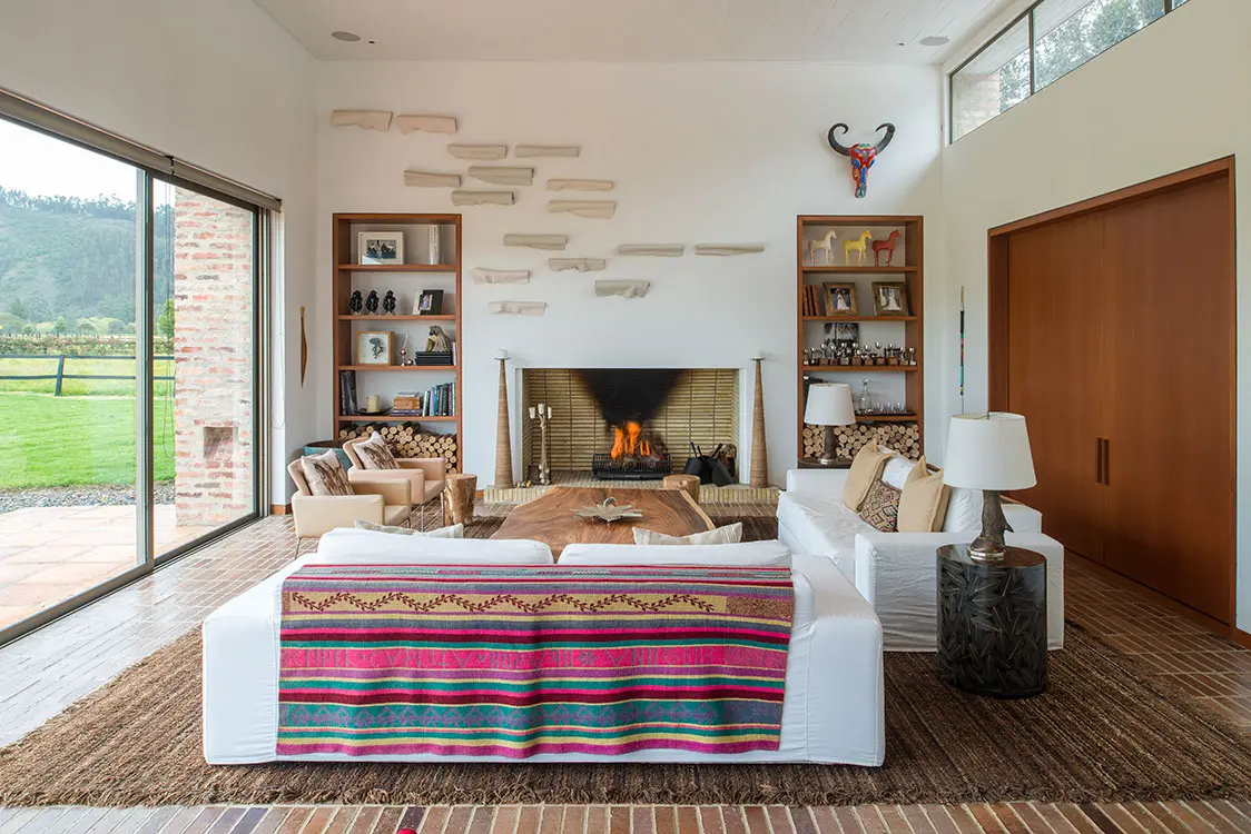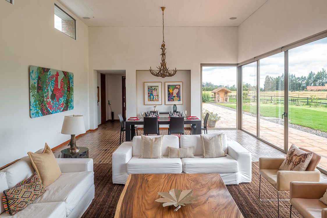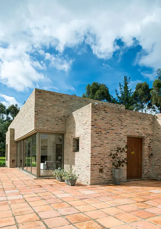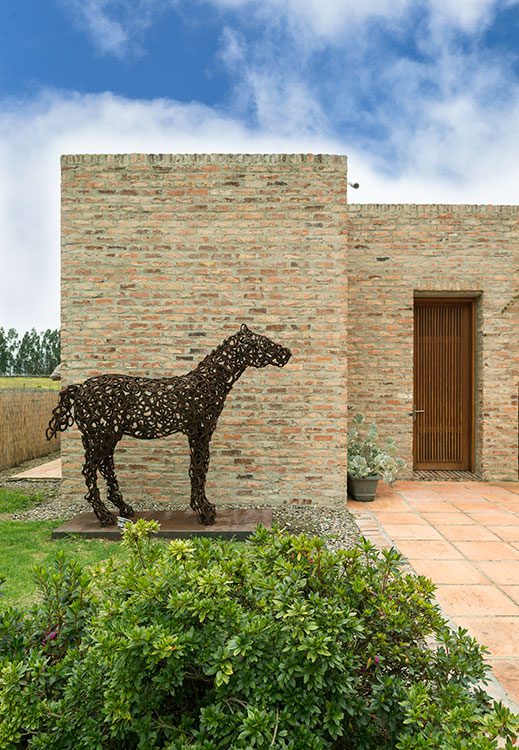 Los propietarios de esta casa, una pareja colombo-argentina y sus hijas, la describen así, como su pequeña “chacra”, un hogar cómodo y sencillo, enclavado en medio de la naturaleza y envuelto por la omnipresente vegetación de la sabana de Bogotá. Es una construcción de geometrías claras y materiales austeros, entre los cuales destaca el ladrillo en sus múltiples presentaciones, rodeada por amplias extensiones de verde, contexto ideal para albergar a la familia, a sus perros, a los caballos de polo (una de las grandes pasiones de su propietario) y a una burra.