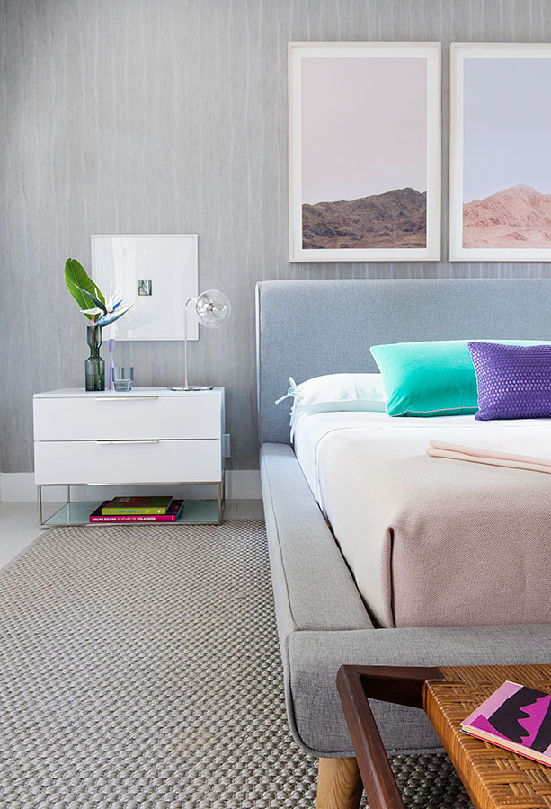 En la habitación principal cuelgan dos fotografías de imágenes desérticas en colores suaves que mantienen el espíritu escandinavo. Son piezas de la artista estadounidense Jordan Sullivan. “Cuando elegí esas dos obras me pareció que lo mejor que podía usar para la pared era un papel de colgadura gris que compré en la tienda Maharam, en Manhattan. Su patrón es muy sutil y contrasta de forma muy natural. A partir de ahí empecé a desarrollar el resto del espacio”, explica el colombiano, quien fundó en EE. UU. la firma de diseño interior Diego Alejandro Design.