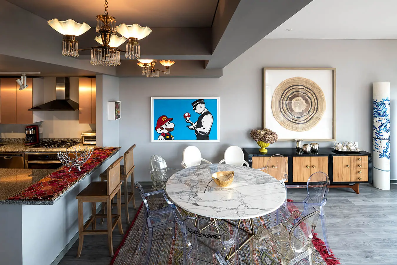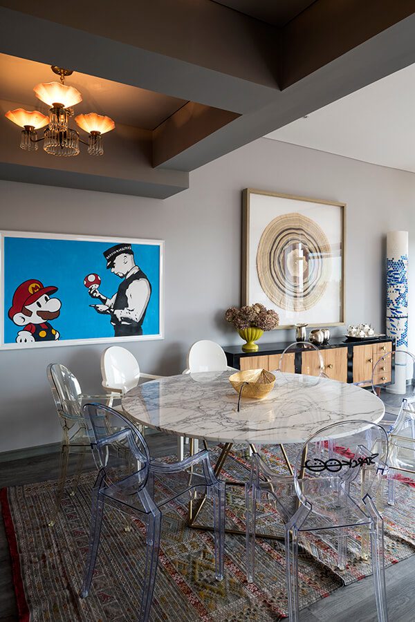 La sensación de liviandad del pesado elemento se ve reforzada por una serie de sillas plásticas a su alrededor, las Ghost Chairs del diseñador industrial francés Philippe Starck, que en sus versiones tanto transparentes como opacas ofrecen un elemento de contraste. De esta manera la mesa, su base y sus sillas forman un conjunto único, de carácter ecléctico y contemporáneo, que se posa sobre una alfombra tradicional, adquirida en Marrakech, la cual trae consigo el recuerdo del compromiso de la pareja.