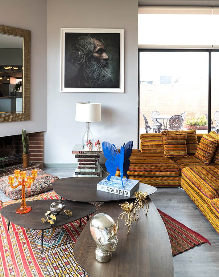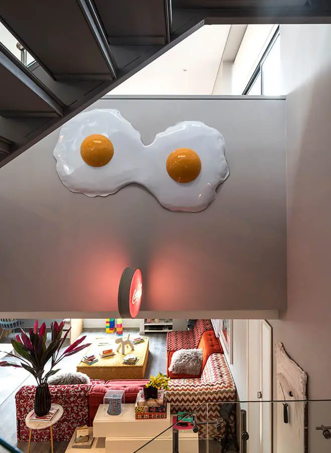 Walter, el protagonista del retrato que encabeza la sala, tomado por el fotógrafo Lucho Mariño, habitó por un tiempo el taller de la diseñadora y el día que se iba a ir optó por ubicarlo en este espacio. Los huevos fritos, que dan vida a la escalera, aparecieron en una vitrina sobre la carrera 11, en el norte de Bogotá; creación de la diseñadora Estefanía Neme, al ser observados por Kika Vargas migraron inevitablemente a este hogar.