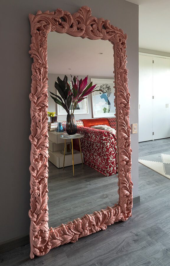 Por su parte, el sofá de la sala fue heredado y luego tapizado a partir de una elección conjunta sobre el nuevo material por utilizar. Sus compañeras, las sillas de cuero, fueron adquiridas en Medellín y vienen con el recuerdo de la participación de la diseñadora en una edición de Colombiamoda. El espejo rosado, con su talla barroca y meticulosa, primero fue blanco, luego pelado y avejentado, hasta que finalmente encontró su color y su personalidad actual.