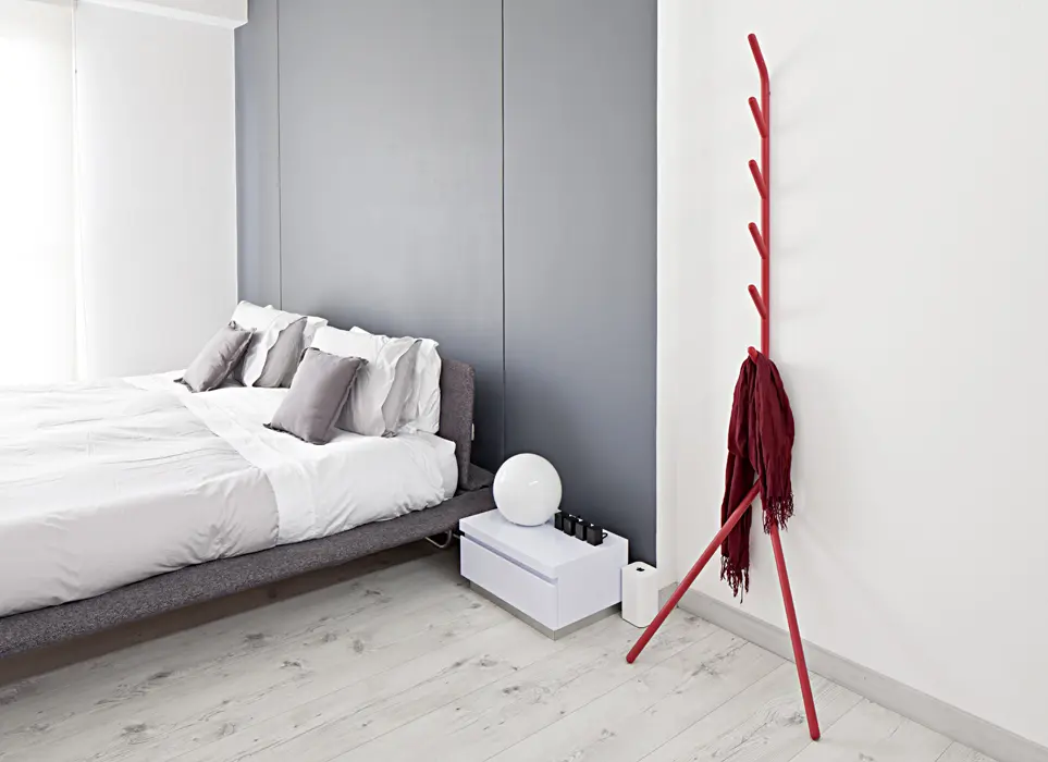 En la sala dos tonos de gris crean un contraste entre el sofá, que es más oscuro, y las sillas, separadas de este por una mesa de vidrio transparente que no compite con la tonalidad protagonista. Cada espacio del apartamento tiene un accesorio funcional rojo que corta con la neutralidad: en el comedor hay un centro de mesa de madera; en la sala, un revistero de acrílico, y en la habitación principal, un perchero de metal de 1,8 metros de alto.