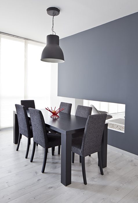 Lámpara de la firma sueca ikea –de metal pintado de gris– y el comedor de la marca danesa boconcept.
