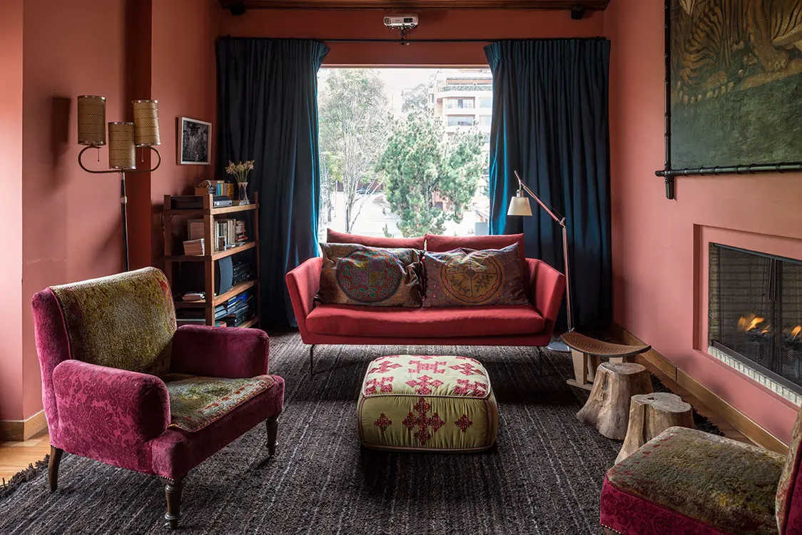 La diseñadora bogotana Yasmin Sabet y su esposo, el músico madrileño Pedro Gamero del Castillo, optaron por una decoración ecléctica, solo tuvieron que ver tres apartamentos para decidirse por este dúplex en los cerros de Bogotá. Tras vivir muchos años por fuera, primero en Londres –donde ella estudió arquitectura– y luego en Madrid –donde se conocieron y se casaron– decidieron regresar a Colombia para que sus hijos crecieran en un entorno más familiar. “Mi mamá es paisa, y mi papá, egipcio, pero se quedó aquí –aclara con una sonrisa–. Queríamos que los niños tuvieran una infancia similar a la mía, que transcurrió entre Medellín y Bogotá”, explica Yasmin, mientras camina hacia la biblioteca, un espacio íntimo y acogedor, separado del salón por un muro suelto con una chimenea abierta hacia ambos lados.