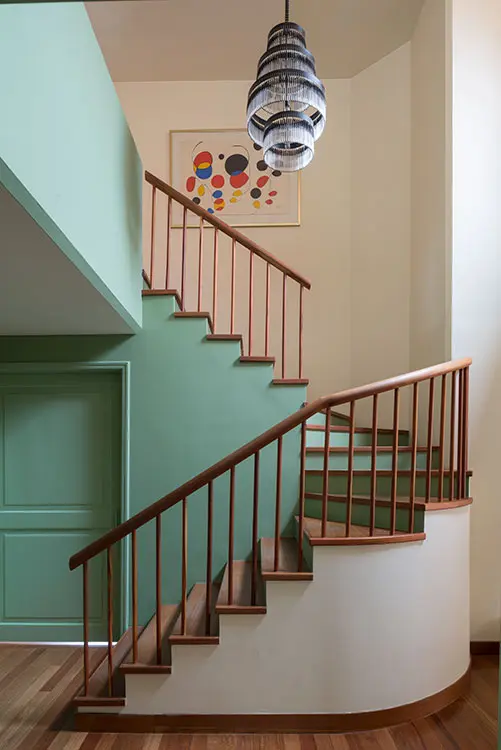 La escalera que conduce al segundo piso fue reformada en su totalidad, originalmente tenía baranda de hierro forjado y piso de mármol. La pieza más llamativa de este espacio es la lámpara de techo, hecha con bolígrafos bic, una creación del diseñador español lucas muñoz.