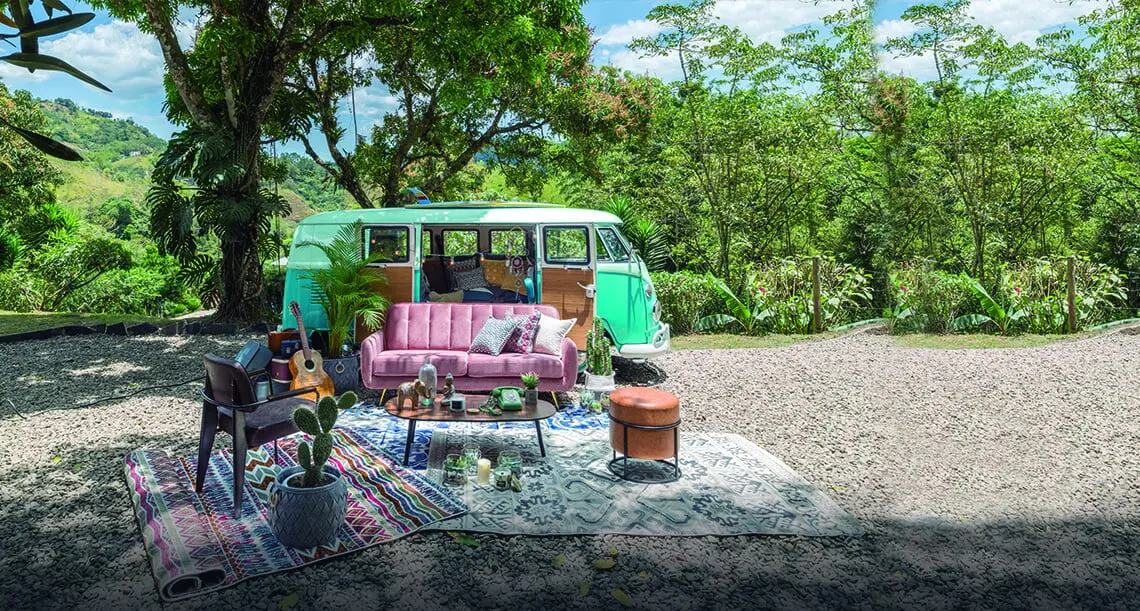 Incluso al aire libre, con los elementos correctos, es posible reflejar un estilo, personalizar un espacio. En esta oportunidad, accesorios como los canastos tejidos referencia Bali y Ring; las figuras Buda Cairo y Elefante Cairo, y los tapetes rectangulares Mosaic V, Mosaic IV y Atalaya, por solo mencionar algunos, dan un toque étnico y colorido a esta propuesta.