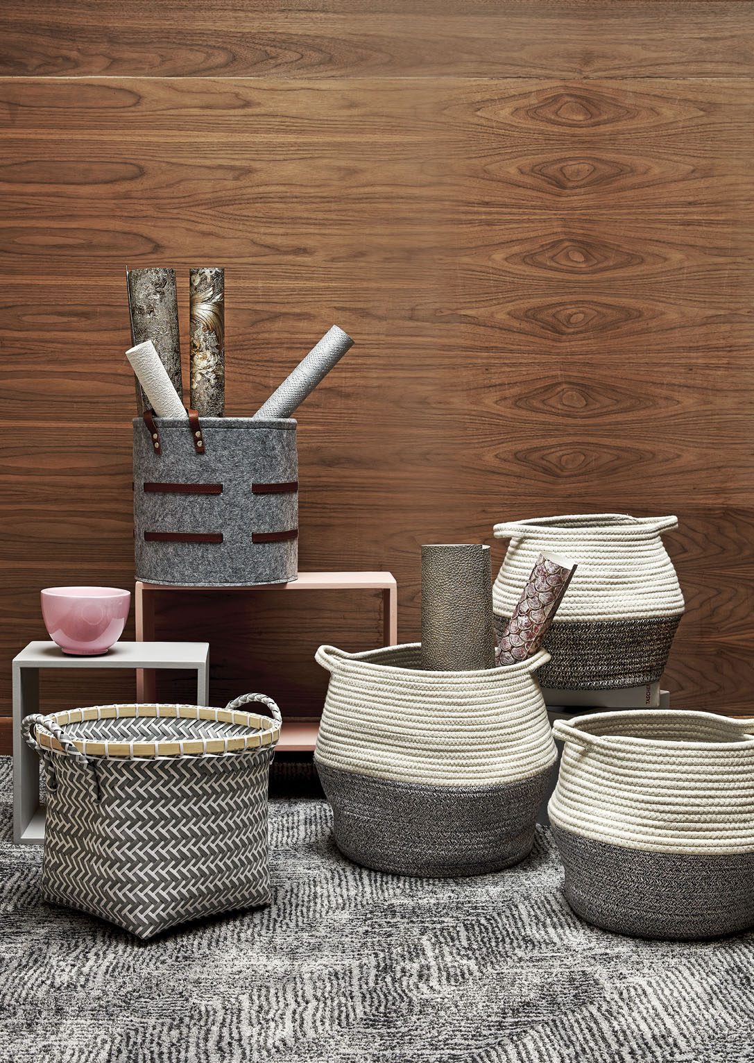 Papeles de colgadura de la colección No. 6 de Roberto Cavalli, en Papelillo y Armonía. Canasta, ref. Ribbon, sobre la repisa; canastos tejidos, ref. Bali, sobre el piso, a la derecha; canasta, ref. Cinza, a la izquierda; repisas, ref. Cubo y Rectangular, todo lo anterior de Tugó. Bowl, de plástico rosado, de Zientte. Tapete, ref. Play, de Tejidos LAV.