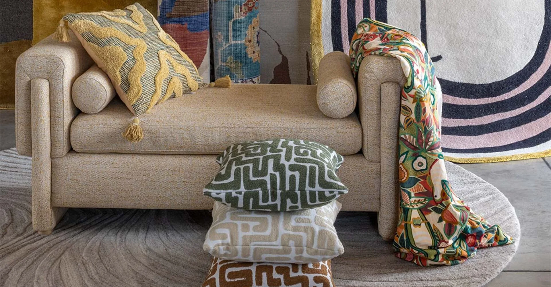 En el universo del diseño de interiores, los pequeños detalles son capaces de generar grandes transformaciones. Los textiles —tapetes, mantas, cojines y manteles— no solo complementan un espacio, sino que lo dotan de carácter, suavidad y equilibrio. Cada tejido y cada textura aportan una sensación única, por ejemplo, movimiento que da dinamismo, calidez que invita a quedarse y un confort que convierte cualquier rincón en un refugio personal. En ellos reside la verdadera magia de la decoración: transformar lo cotidiano en memorable. Diseño con tapetes, mantas o cojines Atrás, a la izquierda, la alfombra en la referencia Seventy; a la derecha se ubica la alfombra ovalada titulada Faccia focus, todo lo anterior lo encuentra disponible en Kare . Enrollados, tapetes en la referencia Libba; atrás, al centro, el tapete denominado Elio, todo lo anterior disponible en Tejidos LAV . Diván; cojín amarillo Kassa; tela Casamance Xalapa, de C.I. Textil; cojines Tela Alhambra Azalai, de C.I. Textil, todo lo anterior en la tienda de Kambora .