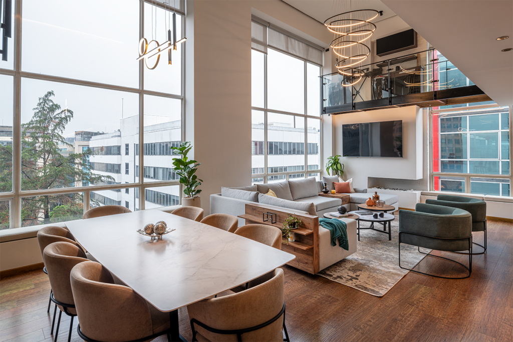 La iluminación —natural y artificial— es tan importante como la calidad de los espacios. A través del gran ventanal de la sala se ilumina la zona social durante el día, y a medida que transcurren las horas la atmósfera se va transformando mediante el uso de una gran variedad de luces. La selección de cada dispositivo —lámparas, cintas LED, spots, etc.— obedece a las necesidades lumínicas, según la actividad.