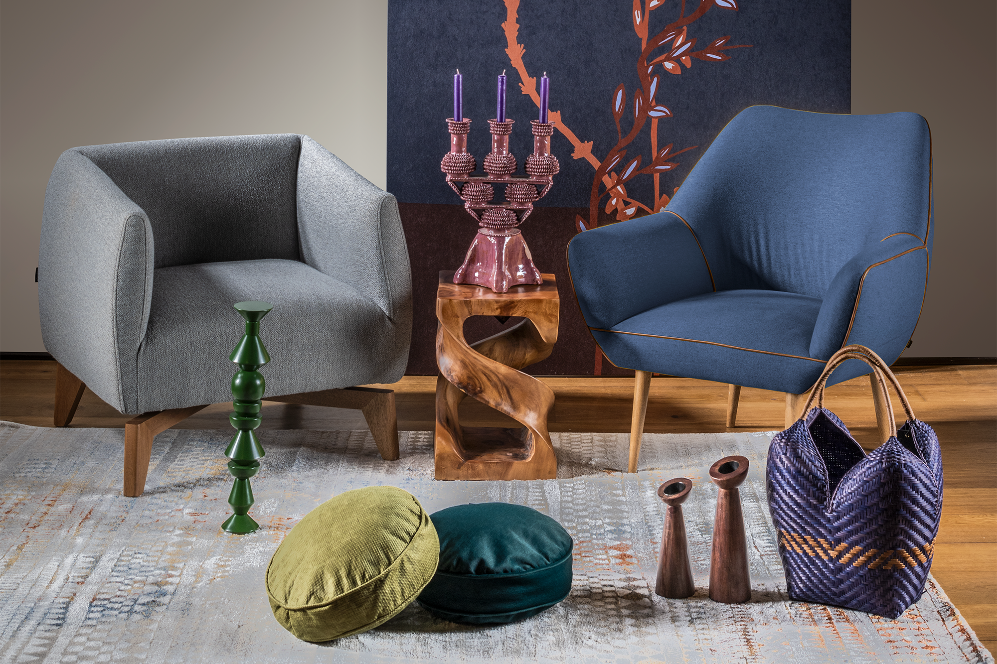 Poltrona referencia Folies, de Folies. Candelabro denominado Marva Lila, de barro vidriado, de Michoacán (México), diseño de Marva Studio, en Alta Estudio. Columna, referencia Endless Balance Mini, diseño de Susana Garavito, de Basalto Studio. Por último, tapete Relato, que lo encuentra en Tejidos LAV.