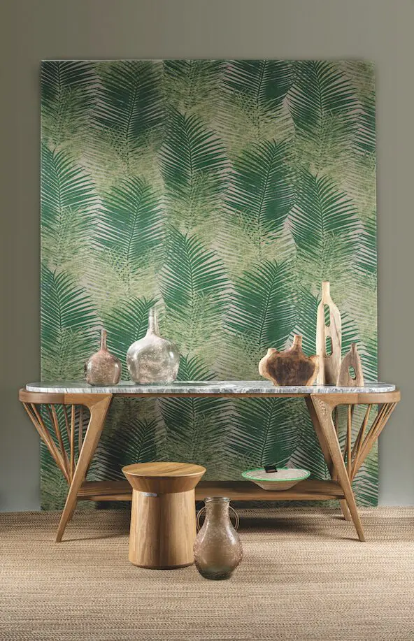 Página opuesta. Papel de colgadura Chromatic, ref. 45104, de Papelillo y Armonía. Consola, ref. Victoria, con top de mármol Silver Sea texturizado; cuenco de fique pequeño, color natural y borde verde, en la parte baja de la consola, ambos de Zientte. Garrafa, ref. Victoria, de 26 cm, a la izquierda; garrafa, ref. Victoria, de 38 cm; jarrón, ref. Cántaro, de 32 cm, en el piso, todosde la firma Just Home Collection, en Homecenter.