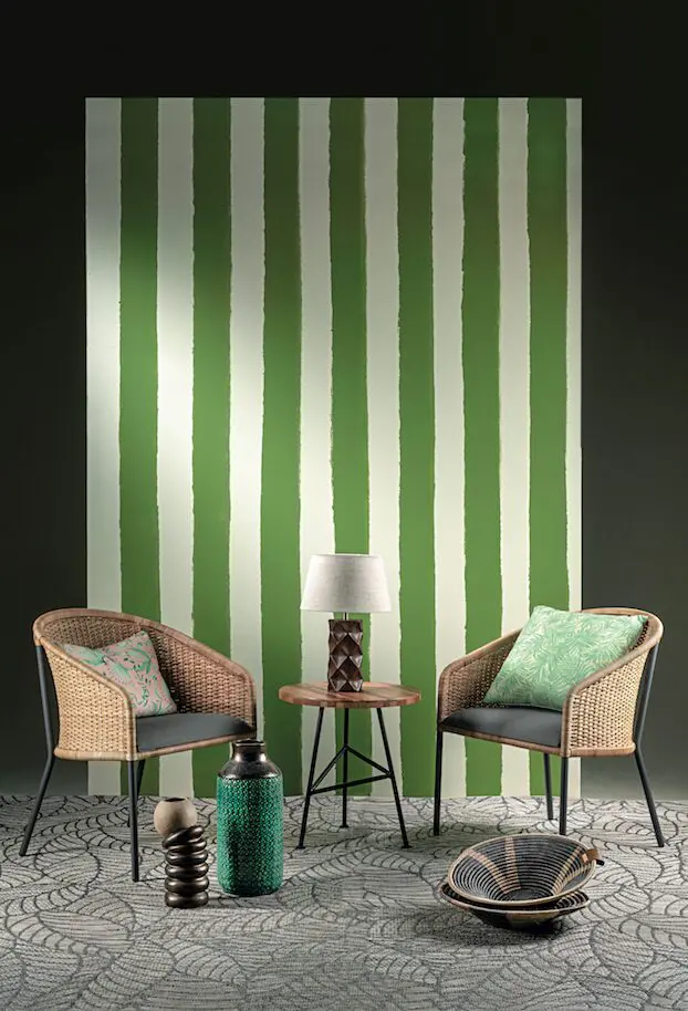 Jungle Green, de Interiority. Florero, ref. Ikebana, en el piso a la izquierda, colaboración entre De La Rocha y Mirron. Lámpara de mesa, ref. Freder; florero verde, ref. Kaula, de 42 cm, todo de la firma Just Home Collection, en Homecenter. Tapete, ref. Mira, 100 % de polipropileno, de Tejidos LAV.