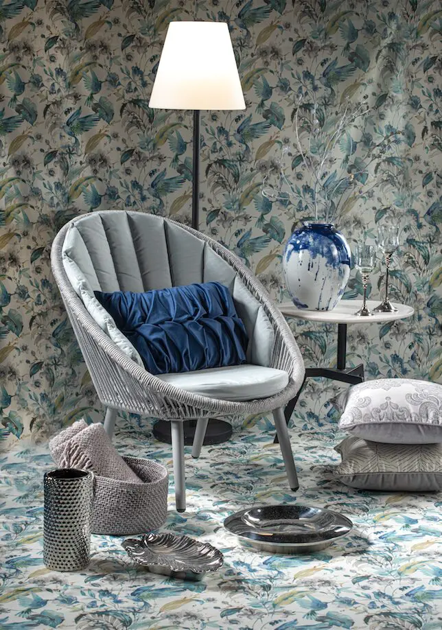 Tela, ref. Afternoon Amble Dream Blue, al fondo; poltrona para balcón, ref. Shell; cojín, ref.