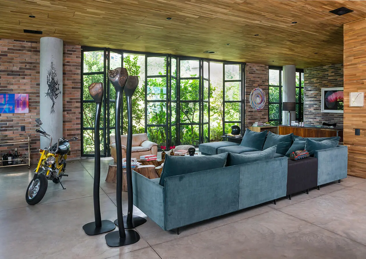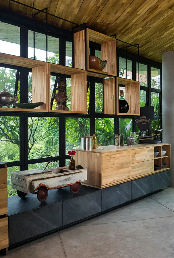 A su vez, el salón y la oficina se integran. Mesas de centro hechas con troncos de árboles, sofás con un diseño austero y un escritorio en un rincón se colman de libros y objetos que relatan el andar de su propietario por la vida. “Una casa se llena de chécheres; de objetos que uno va recogiendo con el tiempo”, dice el chef, cuyo hogar congrega fotografías de su familia, obras de arte y herramientas de cocina…, todas exhibidas como piezas que dejan ver la identidad de quien ahí vive.