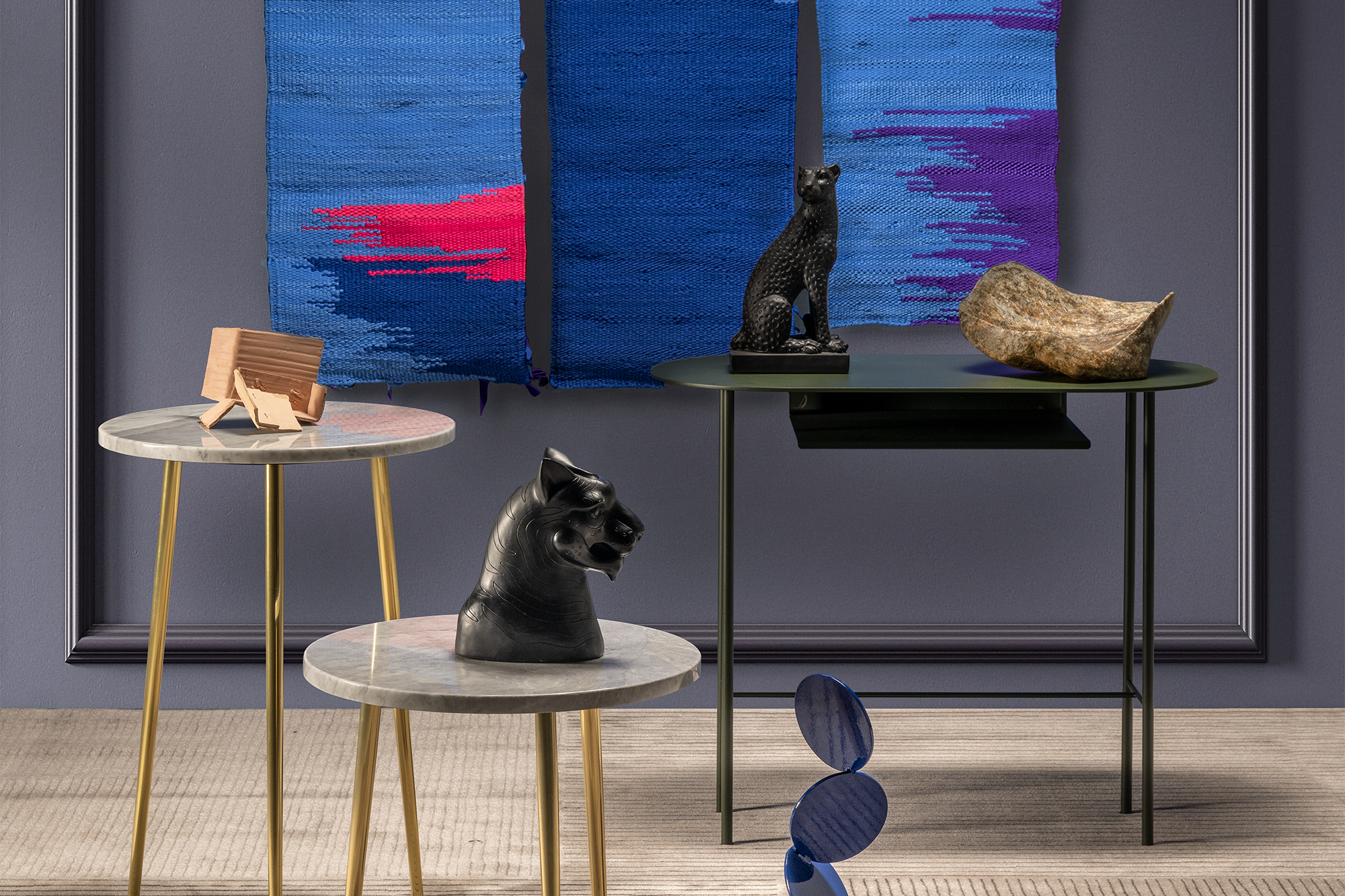 En la mesa, a la izquierda, de la serie Cajas de cartón, cerámicas 2023, de la artista Priscila González. Adelante, base, Tigris negra, de Eightmood, en Belgravia. En el piso, Círculos perdidos, escultura azul del artista Juanka Valencia. Tapete en la referencia Patina disponible en Tejidos LAV.