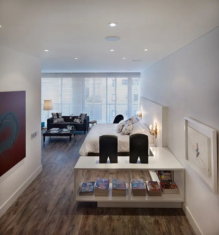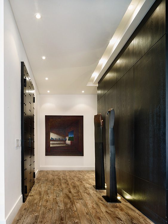 Tan pronto se abre el ascensor, el visitante se encuentra con una imponente puerta negra cuyo estilo recuerda a las de las bóvedas de seguridad. Al empujarla, dos esculturas del artista Hugo Zapata, iluminadas con focos indirectos, son las encargadas de dar la bienvenida. Y tras ellas, un muro de madera del mismo color con el poro abierto. Si la persona gira a la izquierda es conducido a la zona de las habitaciones, si lo hace a la derecha, al área social. Al tomar la primera opción, otra puerta negra corta el paso. Resulta inevitable quedarse observando y palpando la tela repujada con la que está forrada. Es el último elemento que separa el corredor de las alcobas.
