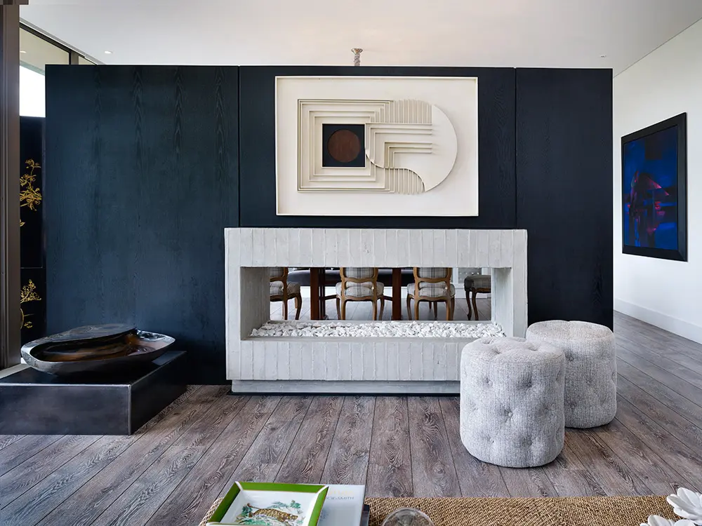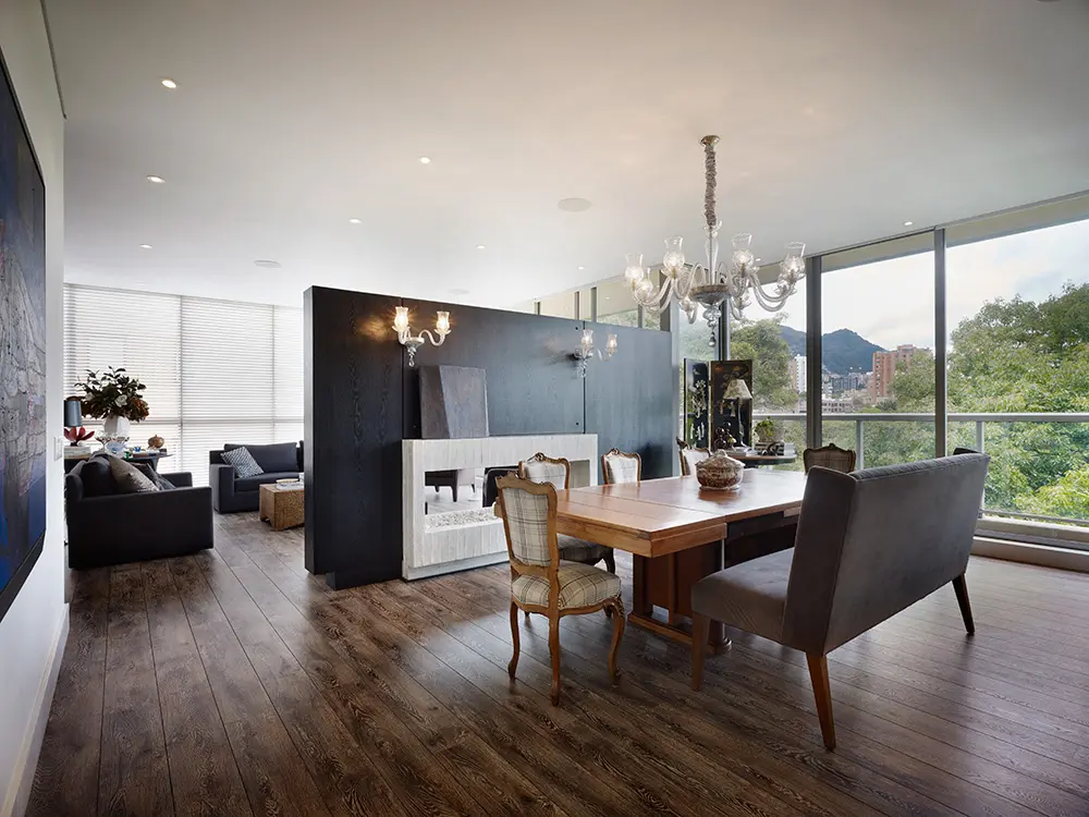 Un muro de madera negra con el poro abierto, que contiene una chimenea de gas con estructura de concreto, separa la sala del comedor. Sin embargo, esta estructura no fue diseñada con este fin, su verdadero objetivo es exhibir una obra de Eduardo Ramírez Villamizar.