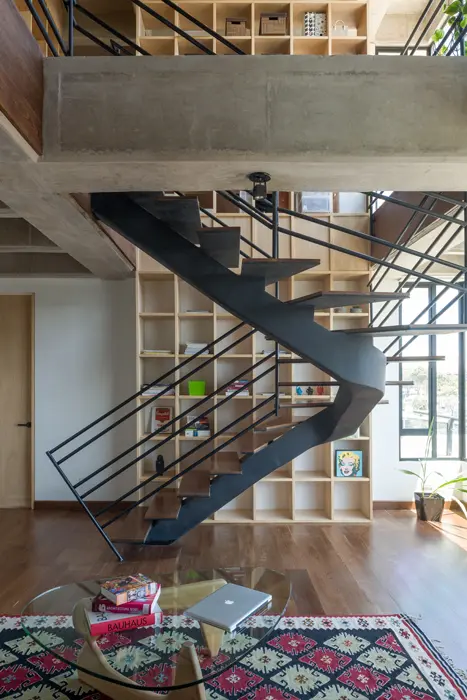 En contraste con el núcleo circular está la estructura a la vista, los acabados tectónicos bruscos y las repisas de cuadrículas que permiten que la luz atraviese los vacíos creando un juego de luces y sombras muy particular. Teniendo en cuenta esta característica, la iluminación está sobre rieles internos con los bombillos sueltos. Todo perfectamente sistematizado para que pueda ser controlado desde un iPad.