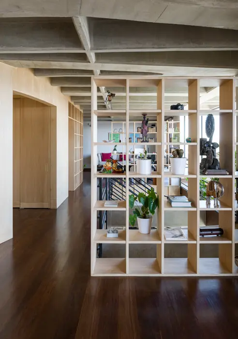 En cuanto a la carpintería, los arquitectos sugirieron retículas y repeticiones que juegan con la profundidad y sus dilataciones para generar ambientes abiertos y generosos, cálidos y amables. Marfil, perillo, guáimaro de Santander y sapán componen la gama de maderas de este apartamento moderno que rompe con los modelos convencionales y le da paso a un espacio donde lo tradicional, lo contemporáneo y los detalles más personales de sus propietarios se combinan a la perfección y crean un ambiente estéticamente audaz y, a la vez, auténticamente acogedor.