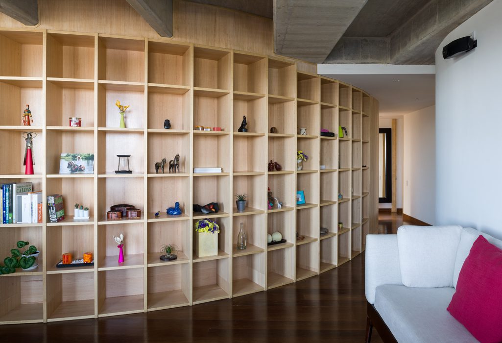 El apartamento, de 380 metros cuadrados, se compone en el primer nivel, por donde se accede, de un núcleo central que es un muro curvo enchapado de madera y que vincula completamente la zona social con un espacio adaptado para trabajar, tres habitaciones, un gimnasio, la cocina, el comedor y la sala. “Este elemento se volvió muy importante, siempre buscamos que las circulaciones no sean simplemente eso, sino que los espacios muertos o inútiles adquieran alguna utilidad. Con el tiempo, las mismas personas le dan ese uso y empiezan a provocar situaciones”, señala Aparicio.