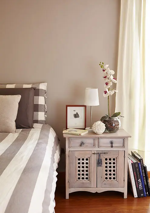 Así mismo, las paredes, tres pintadas de gris para generar volumen y contraste –las demás son blancas–, exhiben fotografías familiares y artísticas que marcan momentos cruciales en la vida de la pareja, que tiene como principio en la decoración de su apartamento el concepto de “menos es más”, según afirma el dueño. “Aquí no hay elementos de sobra, ni saturación de cuadros o adornos. Todo tiene un significado y un simbolismo que nos representa”, aclara. En la habitación principal, las mesas de noche rememoran un estilo colonial que le da forma a una madera maciza tallada en la vereda Puntalarga, en Nobsa, Boyacá.