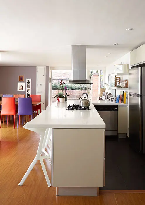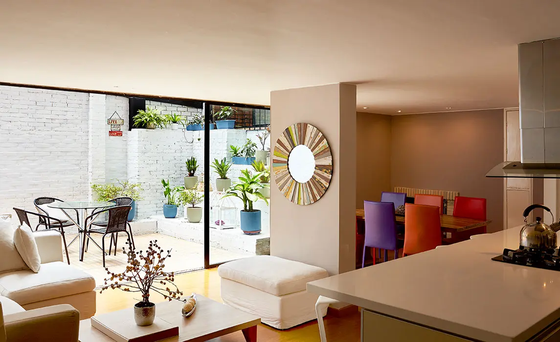 La primera vez que pisaron los 98 metros cuadrados de construcción de este apartamento, ubicado en el primer nivel de un edificio bogotano que data de mediados de los años ochenta, se sintieron atraídos al ver un árbol plantado en la terraza privada, que se independiza de la zona social abierta –compuesta por sala, cocina y comedor– por una puerta y un vidrio que recorre la totalidad de la pared.
