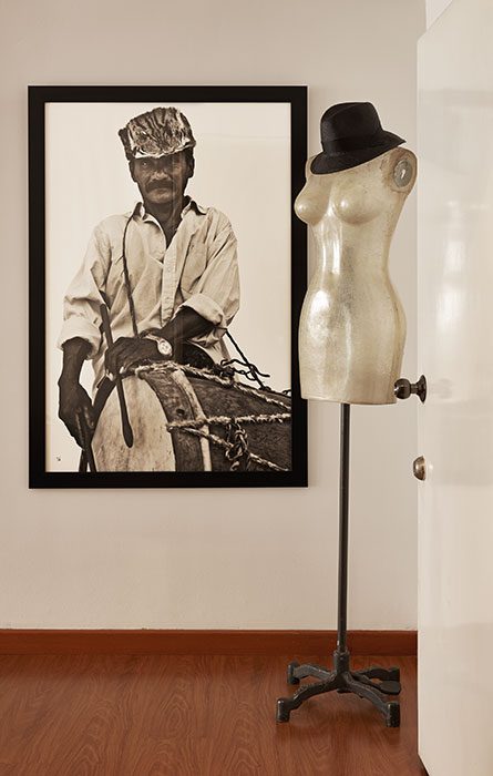 Al abrir la puerta principal del apartamento, la visual apunta a una fotografía en blanco y negro que hizo el artista Manuel Olarte de un músico wayú en La Guajira. El maniquí, elaborado en fibra de vidrio y con base de hierro fundido, fue utilizado en el año 2003 para una exposición del diseñador de modas francés Pierre Balmain, en el Museo Nacional de Colombia. Aquí sostiene un sombrero de Sandoná, Nariño.