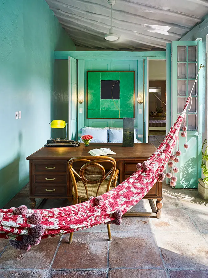 Aunque el paisajismo, a cargo de Germán Castellanos, ya llena de vida todos los rincones de la casa, aún tiene tareas por cumplir. La ceiba que sembraron debe crecer para generar sombra y ayudar a apaciguar el clima en ocasiones sofocante de Honda. El mobiliario de corte clásico, adquirido puntualmente para esta casa, transcurre entre hamacas, piezas de la firma Miscelánea Popular y textiles de Hechizoo, así como de Perú y Guatemala.