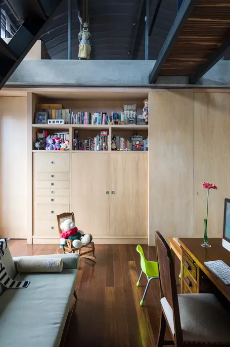 Aunque Delgado desarrolló detalles generales de la arquitectura interior –como la ubicación y el diseño de la cocina, el baño social y la zona de lavandería–, cada propietario tuvo la libertad de individualizar el resto de las áreas. El común denominador enmarca un escenario de paredes blancas, una cubierta de concreto a la vista y un piso largo e ininterrumpido, de extremo sur a norte, recubierto con listones delgados de sapán con tintilla oscura y juntas biseladas, queriendo evocar un aspecto más tradicional.