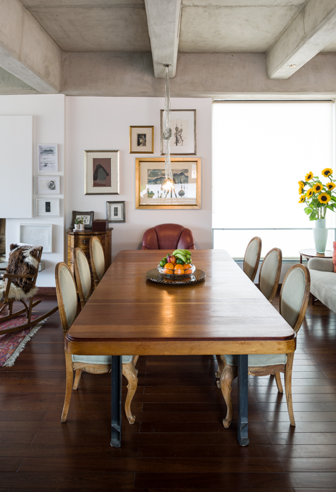 A ese look un poco urbano o industrial, Delgado y su esposa, la diseñadora gráfica Catalina Ruiz, quisieron añadirle a su apartamento –el penthouse– una estética añeja sin dejar de ser moderna, lo que dio como resultado un estilo ecléctico. “Quisimos salirnos del lenguaje tan minimalista y purista que se había trabajado tanto en años anteriores”, explica él. “Nos gusta mucho reinterpretar piezas que circulan por herencia en el ámbito familiar, que hallamos en mercados de pulgas, que caen en desuso o que diseñamos para el espacio, y eso genera una mezcla particular que, en definitiva, conforma nuestro sello personal”, agrega.