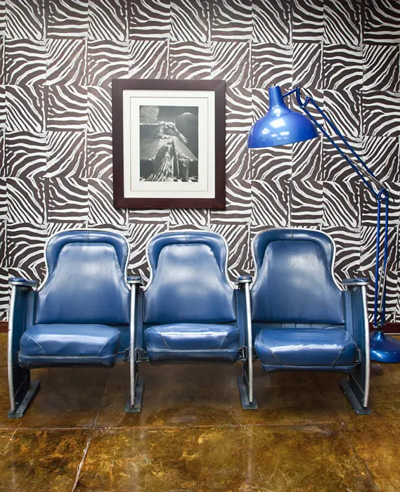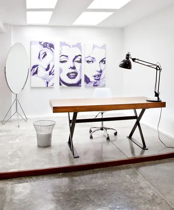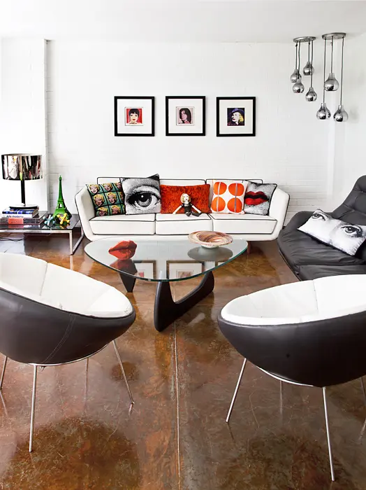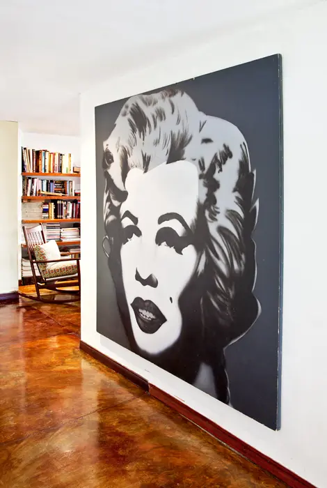 Tres serigrafías de uno de los máximos exponentes del arte pop, ubicadas en la sala auxiliar, combinan con un sofá de 1950 que se modificó con un tapizado de cuero blanco y líneas negras en los bordes para resaltar el volumen. El espacio se complementa con una mesa de vidrio con base de madera lacada, un sofá y dos poltronas de los años setenta.