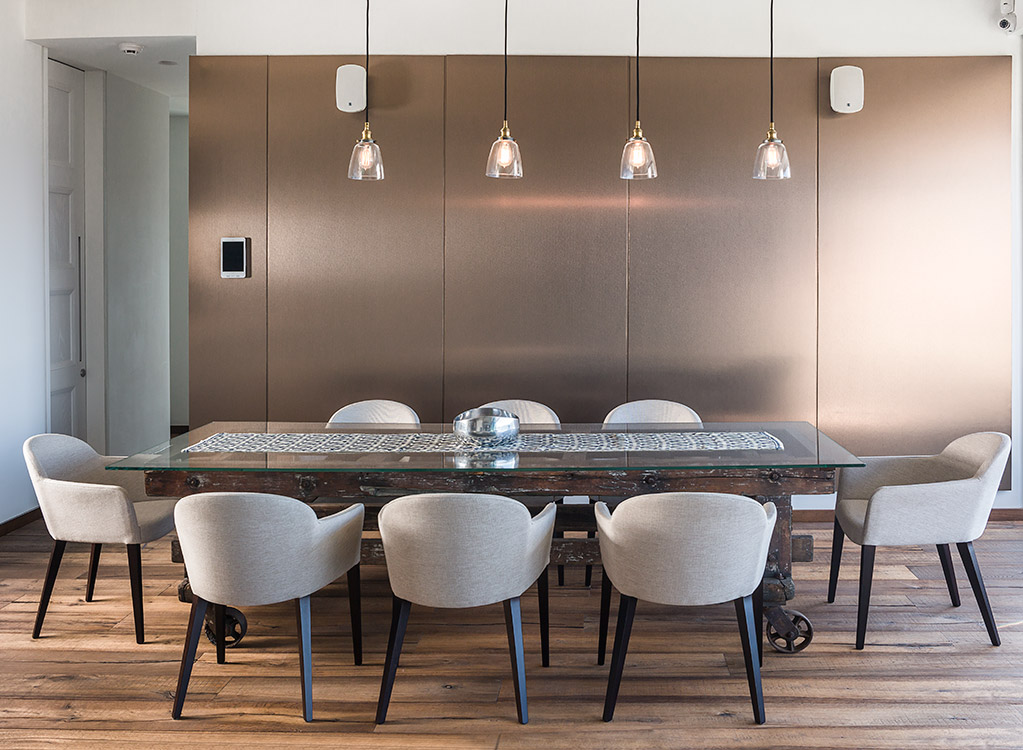 Por otra parte, el casetón del techo en la zona social no es el tradicional de 1,20 m por 60 cm, el arquitecto pidió que duplicaran las dimensiones y lo reforzaran para generar una sensación de amplitud y lograr un aspecto industrial. Continuando con esta idea, la pared en el comedor se recubrió con una chapilla de cobre importada del Japón, que dista de las láminas de cobre martilladas, al tener un terminado más contemporáneo.