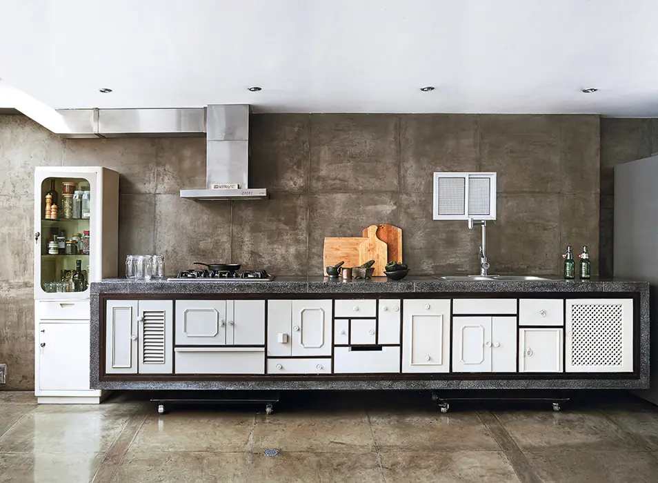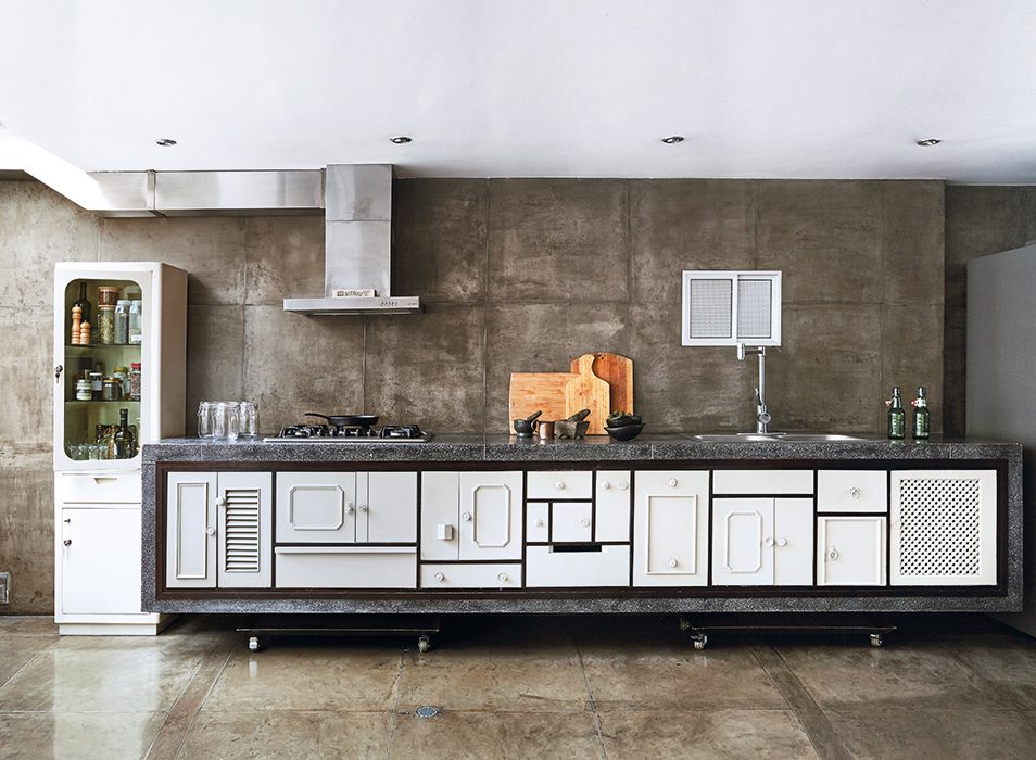 Abajo, “la cocina es la mitad del apartamento”, señala, asegurando que no quería un mesón que la dividiera de la sala. Es, entonces, un área conjunta con ausencia de comedor, donde sobresale un mueble flotado de granito fundido, incrustado con varillas en el muro, tal vez la característica más llamativa del lugar. En la parte superior tiene la estufa y el lavaplatos, y como fachada, un collage de puertas y gavetas, algunas de madera restaurada y otras hechas a la medida, que estuvieron a cargo de la diseñadora industrial Mariana Vieira, que aportó un toque femenino al espacio.