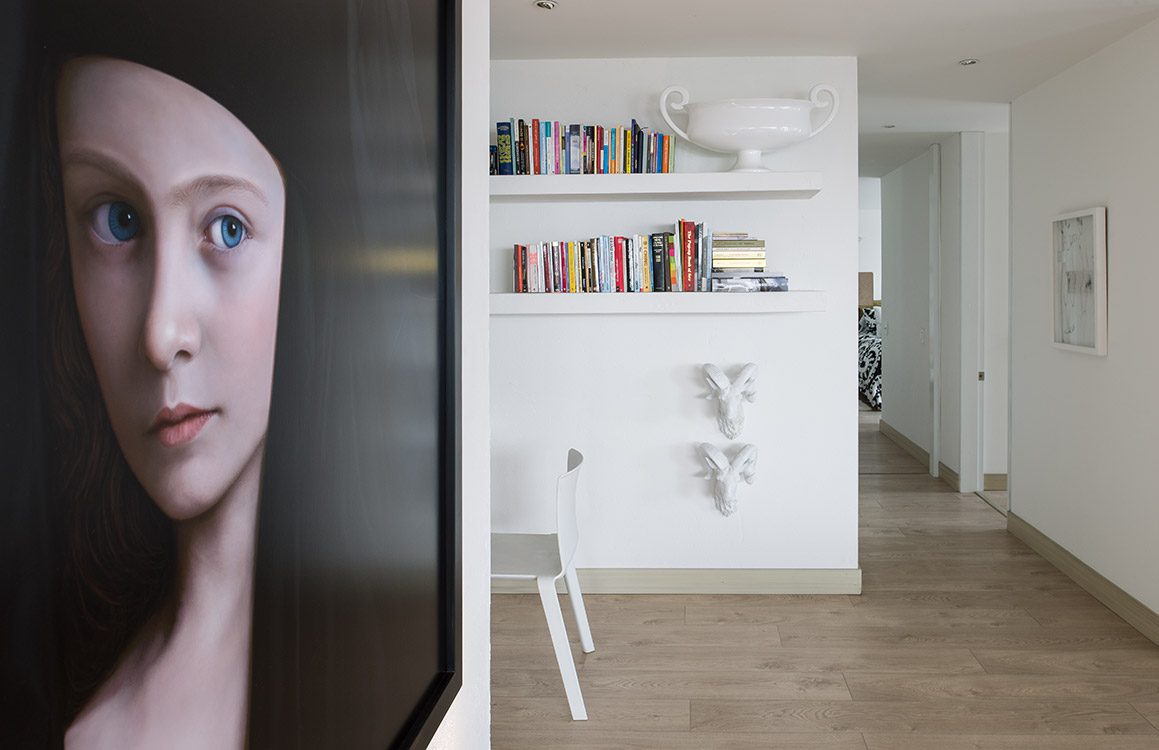 La vivienda, hoy compuesta por dos habitaciones –originalmente eran tres–, la zona social y una biblioteca, está colmada de objetos y esculturas que pueden cambiarse fácilmente de lugar. Podría decirse que plantea una sobria, dinámica y agradable puesta en escena en la que rotan los elementos y en la que pueden convivir, sin problemas, una sirena con un monje tibetano o figuras de animales variados con pocos cuadros, porque los considera elementos estáticos que no permiten rediseñar los espacios.