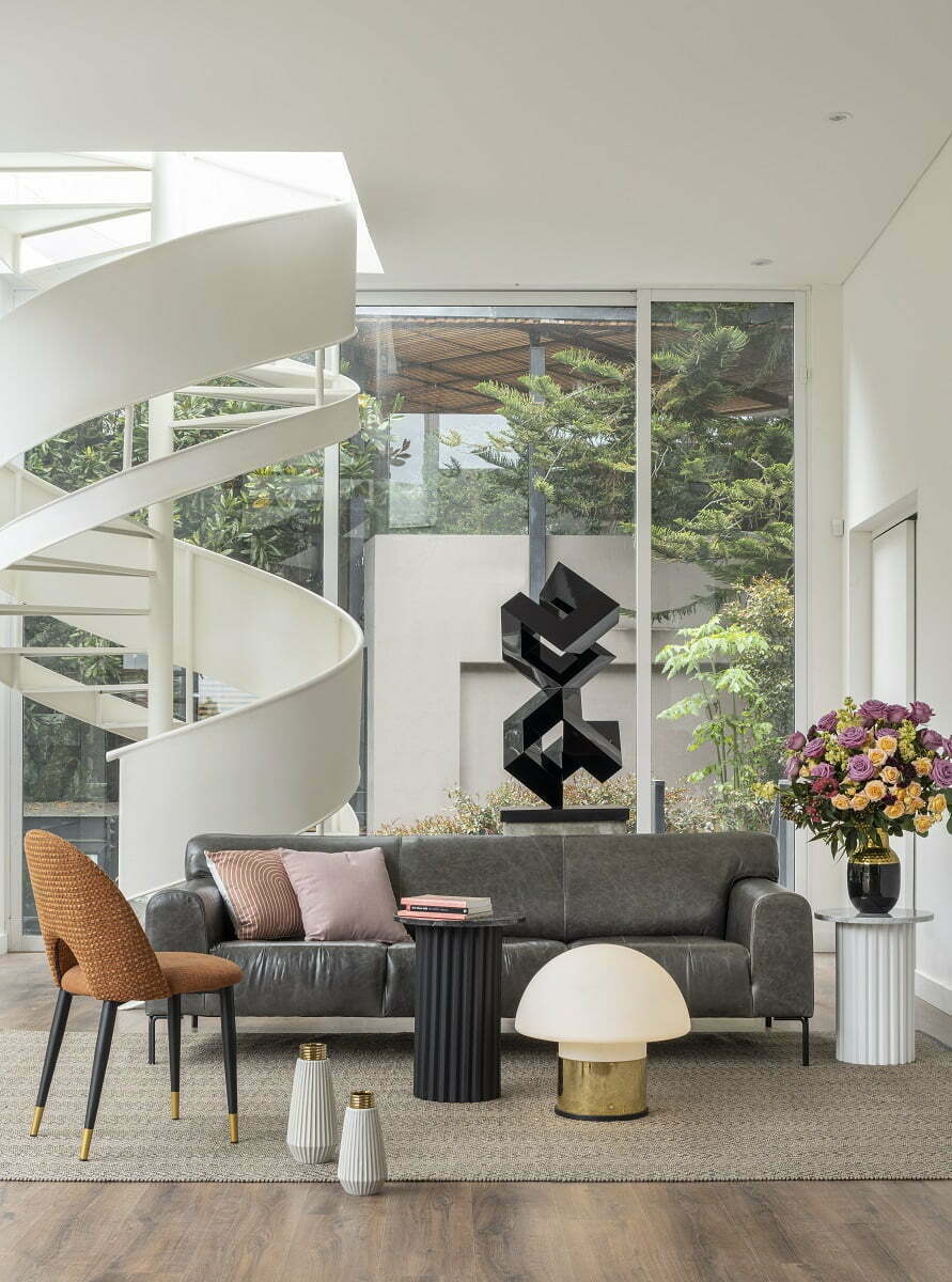 norteamericana, ref. Robert Sonneman, de bronce y cristal, año 1970, de Dessvan. Escultura Puertas y ventanas, elaborada en acero inoxidable y pintura poliéster, año 2022, autor Rodolfo Sánchez Lalinde. Tapete, ref. Hadis, fabricado en polipropileno en telar manual, de Tejidos LAV. Floreros, ref. C3-21 Shell II Dolomita, color gris y dorado; funda cojín, ref. C1-22 Lines, de poliéster, a la izquierda, todo lo anterior de Tugó.