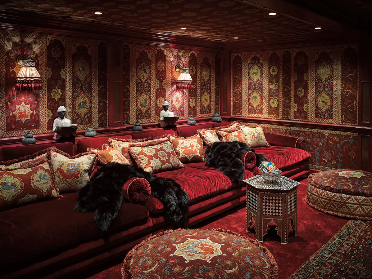 El cuarto de entretenimiento está inspirado en la herencia turca de la esposa de Hilfiger. Es bastante popular entre la familia, tanto por su valor de diversión como por la generosa otomana diseñada por el interiorista inglés Martyn Lawrence Bullard, que recuerda el palacio de un pachá en Estambul. En la habitación de Sebastián, el hijo de ocho años de la pareja, una gigantesca jirafa del aclamado fabricante de juguetes Steiff mantiene un ojo vigilante a la hora de dormir.