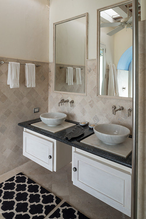 La zona con mayor intervención fue la cocina, donde una pared de fondo en piedra trevertina pulida en forma de diamante, marca la pauta para el replanteamiento de esta área. “Aquí cambiamos los muebles en busca de un look más tradicional que hiciera eco de la arquitectura de la casa. La carpintería de cedro marrón se reemplazó por flor morado con wash blanco. Las puertas de los gabinetes las hicimos en vidrio con molduras de madera, estilo francés, y cambiamos las agarraderas existentes por unas metálicas en forma de cubiertos clásicos”. La iluminación también se replanteó completamente, con la instalación de un riel de luces que proporciona mayor luminosidad a las superficies de trabajo.