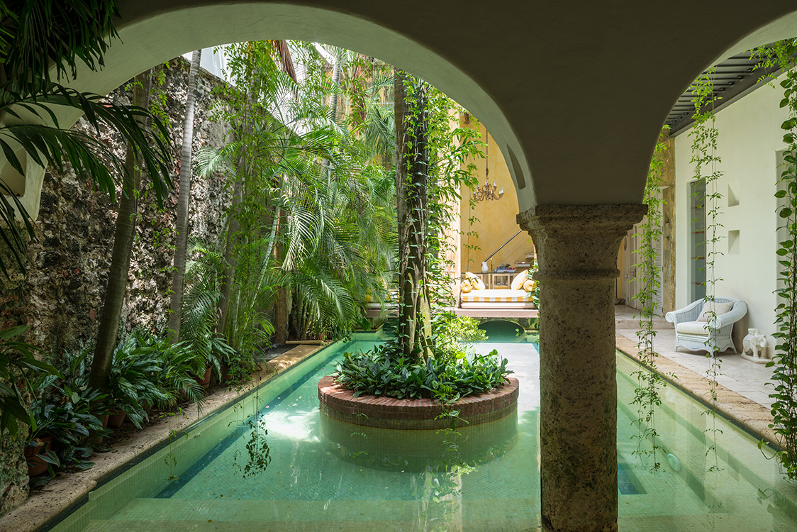 El jacuzzi y la piscina se consideran el corazón de la casa, donde el agua y la vegetación son protagonistas, junto con elementos como columnas y arcos originales de la construcción que cuentan su historia y mantienen la conexión con el pasado. “Es lo primero que se ve cuando se entra en la casa, por eso decidimos poner unas cortinas en la zona del jacuzzi, y una lámpara muy llamativa forrada en cabuya que se convierte en el punto central de esta imagen”. La paleta elegida para esta zona es una combinación de amarillo y blanco, de rayas gráficas, que contrasta muy bien con su entorno, y lo convierte en un espacio alegre, vibrante y acogedor, ideal para estar en cualquier momento del día.